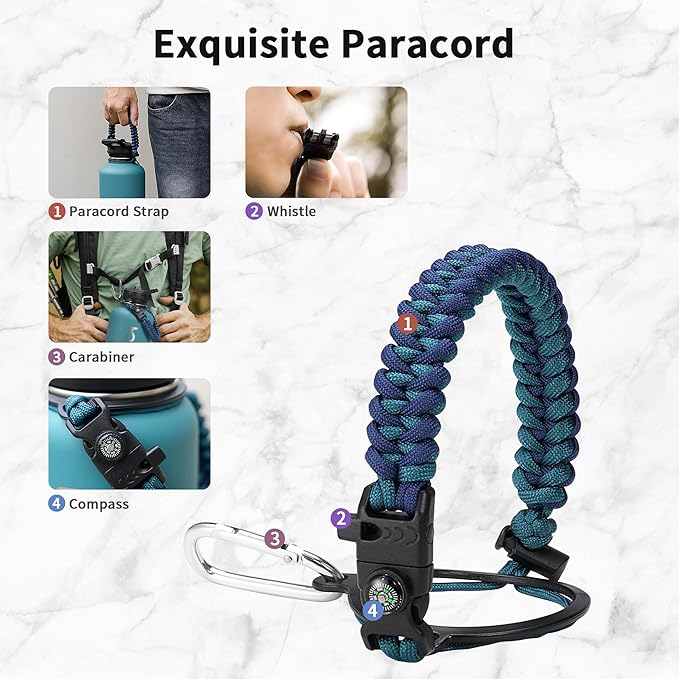 • Full-function Paracord Handle: Brilliant paracord of matching colors bring out the bottle with a touch of youthful vibe. Compact compass and handy carabiner make the bottle the ideal survival kit for expeditions in the wild