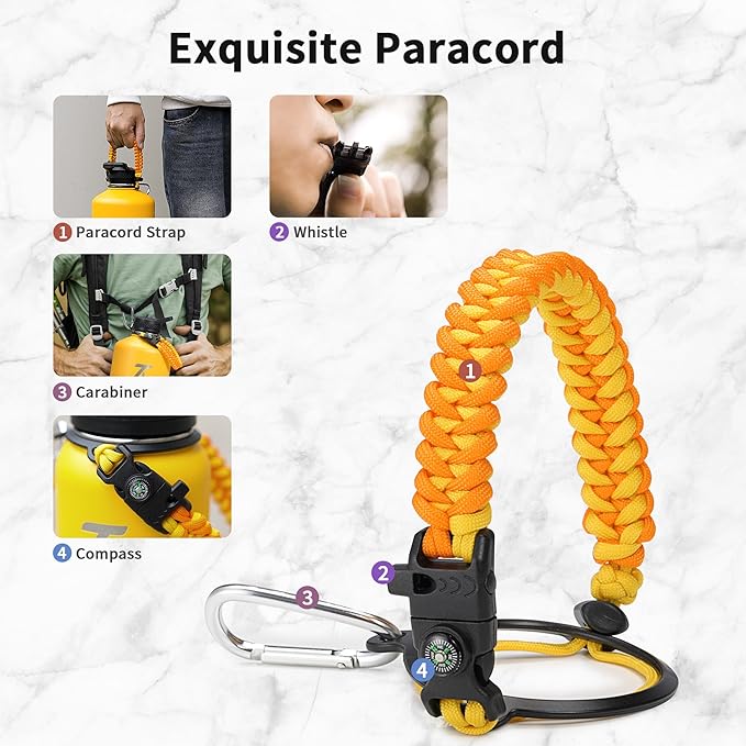 • Full-function Paracord Handle: Brilliant paracord of matching colors bring out the bottle with a touch of youthful vibe. Compact compass and handy carabiner make the bottle the ideal survival kit for expeditions in the wild.