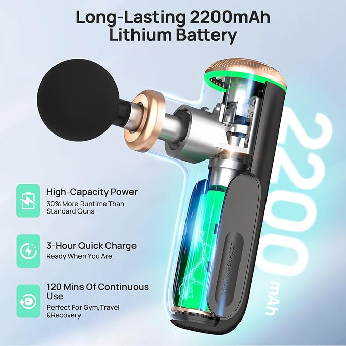 • 【Ultra-Superior 3C Power Battery】This handled muscle massager gun is specially equipped with 3C Power Battery. Compared with other products, it has 3X discharge rate for power supply and 5X battery cycle life. At the same time, 800mAh battery capacity allows it to be used continuously for 5-7 hours.