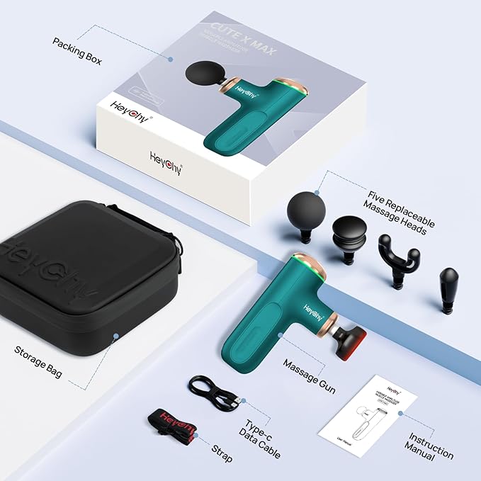 • 【5 Interchangeable Massage Heads】The heated head (50°C/140°F) can promote blood circulation and relieve stiffness 30% faster (compared to non-heating guns). Includes 4 interchangeable heads (ball head, flat head, fork head, bullet head) with a rotation speed of 800-3200 RPM for targeted relief.