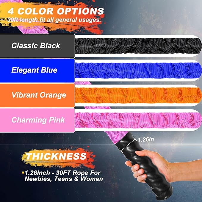 • Multicolor and Multisize Battle Ropes to Choose From: We offer black, pink, blue and orange battle ropes with a thickness of 1.26 / 1.5 inches and a length of 30ft length. Our battle ropes are suitable for all levels and can be used for different training purposes. The 1.26"-30FT battle rope weighs 9.5 pounds, which is suitable for beginners to conduct daily exercises at home, the 1.5"-30FT battle rope weighs 13.5 pounds and is suitable for intermediate - to - advanced professional fitness enthusiasts