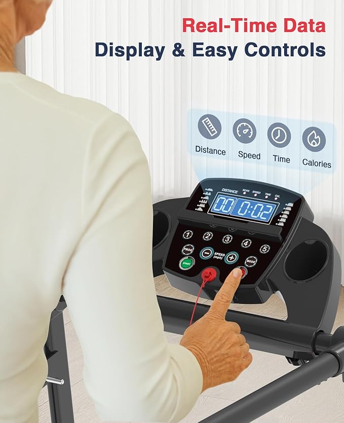 • 【User-Friendly LED Display】- The treadmill for seniors is equipped with a multifunctional LED display, making it simple to monitor time, speed, distance, and calories at a glance. With 12 preset programs and 3 control modes, it supports a variety of fitness goals. Extra features like a cup holder, magnetic safety key, and supportive handlebars provide added convenience for a comfortable and enjoyable workout.
