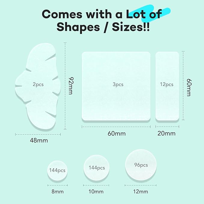 • 4 Versatile Shapes for your different uses: you can use the square/rectangle ones for a cluster breakout, use dot for your small acne, use nose strips on your nose. If there are more of the extra large ones than you need,they are easy to cut as needed