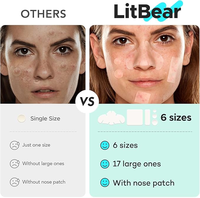 • 6 Sizes 401 Patches: LitBear zit patches come in 6 versatile sizes (8mm, 10mm, 12mm, 20x60mm, 60x60mm, 92x48mm), these combination hydrocolloid patches will help you with the smallest of blemishes to the biggest of breakouts! Choose the best one for your affected area