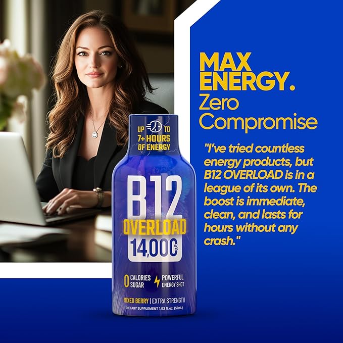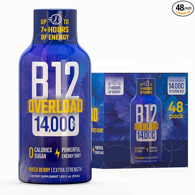 B12 Overload Extra Strength Energy Shot – Mixed Berry – 260mg Caffeine, 14000% B12, Electrolytes – Energy & Vitality Support – Zero Sugar No Calories – Vegan, Kosher, Gluten-Free – 1.93 fl oz, 48-Pack
