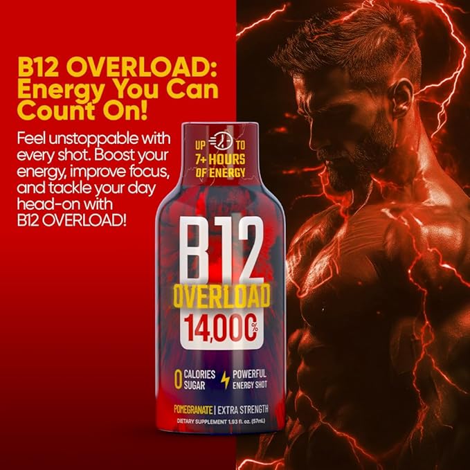 B12 Overload Extra Strength Energy Shot – Pomegranate – 260mg Caffeine, 14000% B12, Electrolytes – Energy & Vitality Support – Zero Sugar No Calories – Vegan, Kosher, Gluten-Free – 1.93 fl oz, 48-Pack