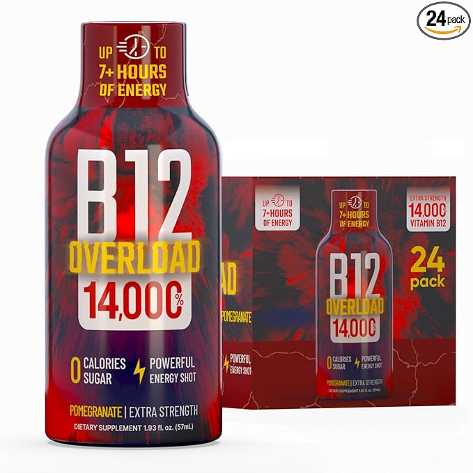 B12 Overload Extra Strength Energy Shot – Pomegranate – 260mg Caffeine, 14000% B12, Electrolytes – Energy & Vitality Support – Zero Sugar No Calories – Vegan, Kosher, Gluten-Free – 1.93 fl oz, 24-Pack