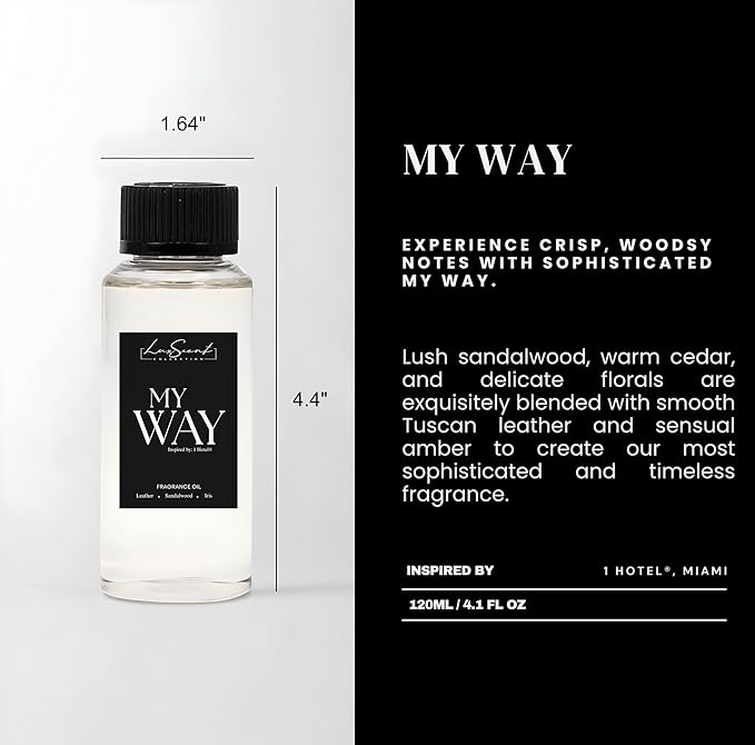• MY WAY Inspired by: 1 HOTEL MIAMI | Lush sandalwood, warm cedar, and delicate florals are exquisitely blended with smooth Tuscan leather and sensual amber to create our most sophisticated and timeless fragrance.