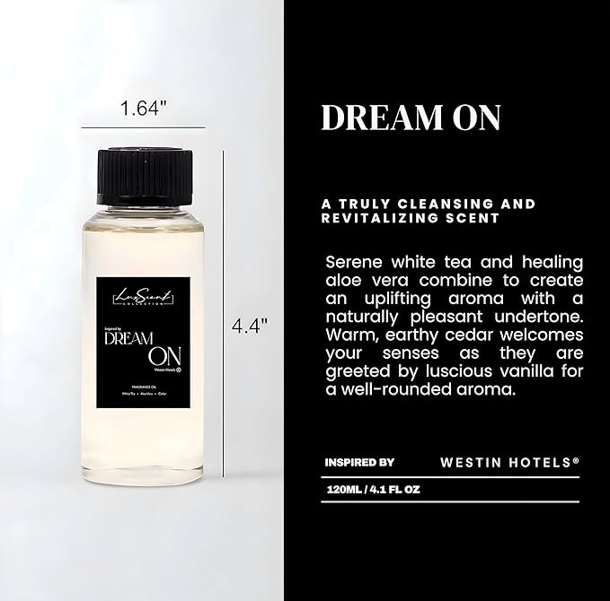 • DREAM ON Inspired by: WESTIN HOTELS | A truly cleansing and revitalizing scent, serene white tea and healing aloe vera combine to create an uplifting aroma with a naturally pleasant undertone. Warm, earthy cedar welcomes your senses as they are greeted by luscious vanilla for a well-rounded aroma.