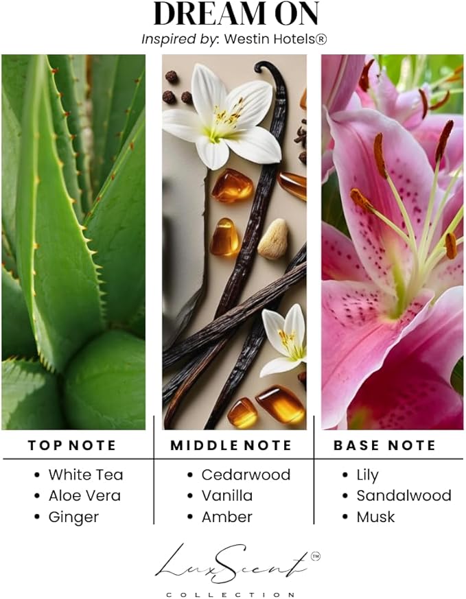 • DREAM ON Inspired by: WESTIN HOTELS | A truly cleansing and revitalizing scent, serene white tea and healing aloe vera combine to create an uplifting aroma with a naturally pleasant undertone. Warm, earthy cedar welcomes your senses as they are greeted by luscious vanilla for a well-rounded aroma.