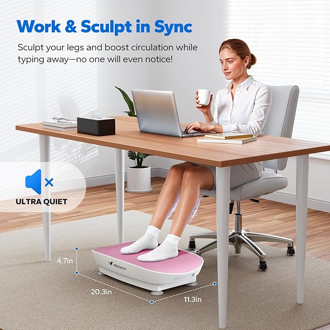 • [Quiet Design, Space-Saving Convenience] Slim vibration plate exercise machine uses noise-reduction technology operates below 40dB (quieter than a whisper). Compact 20.3”x11.3”x 4.7”size fits effortlessly under desks or beside couches. Perfect for home gyms, living rooms, or office breaks—achieve your fitness goals without disturbing others.