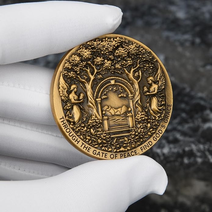 • Serene Angelic Imagery: The reverse side of the medallion depicts two angels standing guard beside an archway, symbolizing spiritual protection and divine grace. The inscription “Through the gate of peace, find God’s grace” adds depth to the peaceful message of the piece.