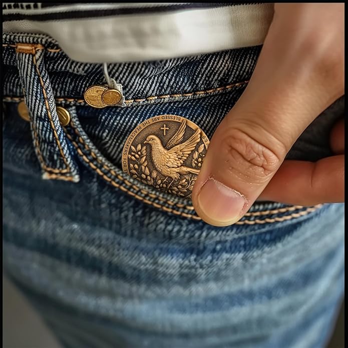 • Symbol of Peace: This medallion features a detailed dove with an olive branch, a timeless symbol of peace. The imagery of the dove in flight represents the Christian ideal of promoting peace and reconciliation, as referenced in Matthew 5:9.