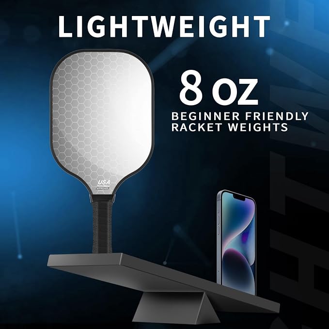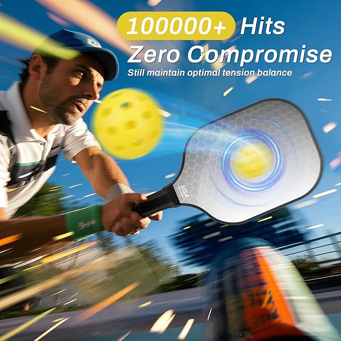 • [T300 Carbon Fiber Construction]Equipped with 2 pickleball paddles crafted from T300 aerospace-grade carbon fiber (each weighing only 8 oz), featuring a 30% higher density than conventional carbon fibers to achieve a high-strength, lightweight structure. Integrated with a shock-absorbing molecular structure design that effectively reduces vibration transfer during impact, prolonging play endurance. Includes 4 pickleballs for immediate gameplay.