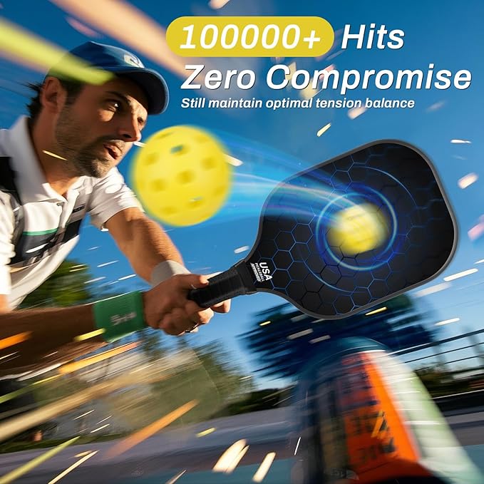 • [T300 Carbon Fiber Construction]Equipped with 2 pickleball paddles crafted from T300 aerospace-grade carbon fiber (each weighing only 8 oz), featuring a 30% higher density than conventional carbon fibers to achieve a high-strength, lightweight structure. Integrated with a shock-absorbing molecular structure design that effectively reduces vibration transfer during impact, prolonging play endurance. Includes 4 pickleballs for immediate gameplay.