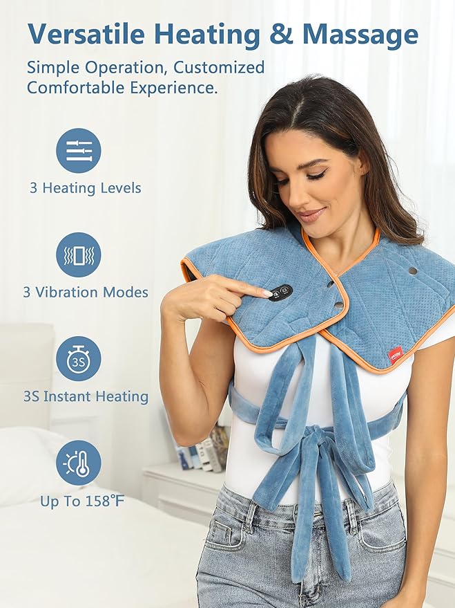 • 3S Instant Heating & 4 Heating Zones:12V large heating pad ,compared with other heating pads, it's designed with 3S instant heating and 4 heating zones to provide ample coverage for your neck, left and right shoulders, and back. The 4 large heating zones strategically target these areas, delivering instantly soothing warmth exactly where you need it most. In addition, it can be flexibly applied to the the waist, abdomen, arms and legs to soothing discomfort