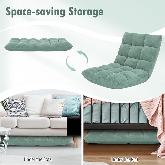 Moccha 14-Position Floor Sofa, Folding Sofa Chair with Back Support, Memory Foam Floor Gaming Chairs for Adults, Adjustable Padded Couch Recliner, Chaise Lounge for Reading, Meditating (Green)