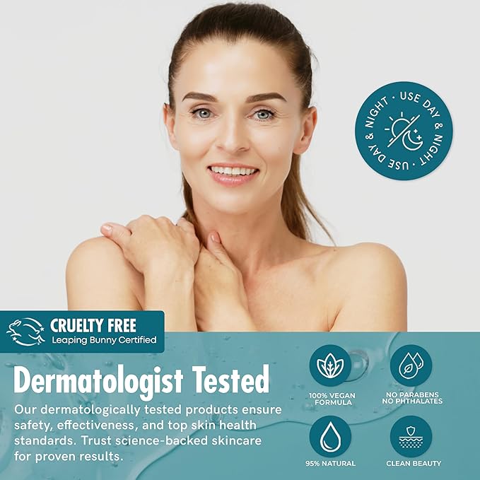 • CLEAN, SAFE & EFFECTIVE INGREDIENTS - Made with 95% natural ingredients, this dermatologist-tested serum is cruelty-free, vegan, and non-GMO. It contains no parabens, sulfates, phthalates, or harsh chemicals, making it suitable for all skin types, including sensitive skin. Experience clean beauty without compromise.