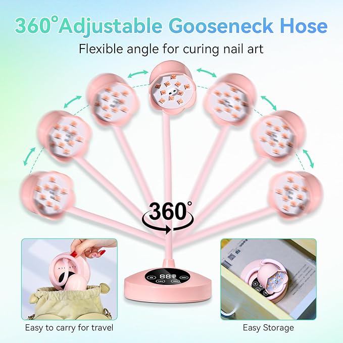 • Portable & Flexible Gooseneck: The size of the pink gel lamp is (Unfolded): 3.7 inches * 3.7 inches * 12.8 inches (Flexible hose: 9.6 inches), small and lightweight. The portable nail curing light with gooseneck can be bent 360 degrees freely, allowing the UV lamp’s height and direction to be adjusted flexibly, ensuring the wireless gel nail lamp always finds the perfect position.