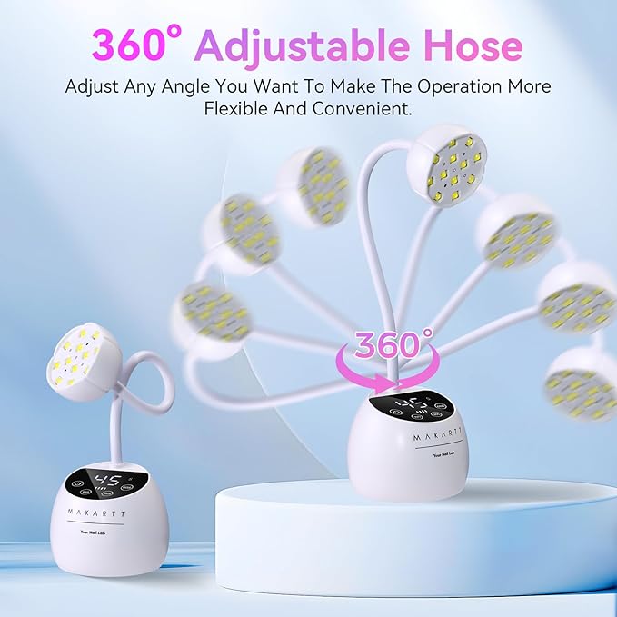 • 360° Degree Adjustable Direction: Makartt UV nail lamp features a flexible gooseneck, allowing you to bend and maneuver it to any angle for optimal curing. It ensures full coverage of gel nails, including hard-to-reach areas like your pinkies and thumbs, for flawless results every time.