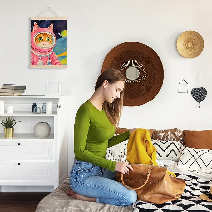 Pink Astronaut Cat Wall Art Poster Framed, Cat Poster for Girls Kids Room Nursery Decor, Whimsical Outer Space Cute Kitten Canvas Wall Art Prints, 12x16 Inches