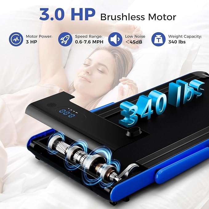 • 3.0 HP Brushless Motor: Featuring a 3HP brushless motor, this walking pad treadmill operates efficiently with low noise (<45dB), perfect for home and office use. Moreover, the powerful motor and heavy duty frame ensure 340lbs weight capacity.