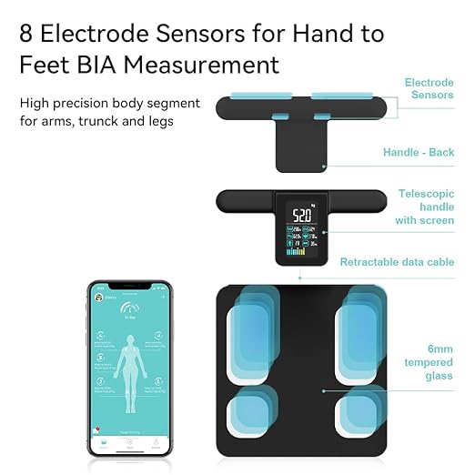• NO MORE LOOKING DOWN: Fitdays bathroom scale features a large, clear 4.1x2.46-inch color display on the retractable handle, allowing you to conveniently view your measurements without having to stare down. In addition to weight, 6 essential body composition will also displayed simultaneously on the screen so you can see them at a glance without opening the app