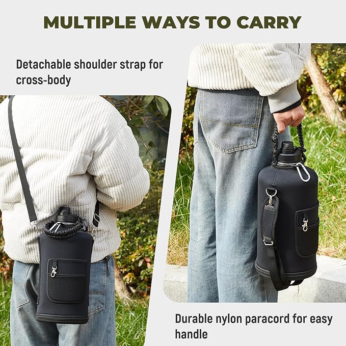 • What’s Included: When you purchase this half-gallon insulated water bottle, you’ll receive 9 premium accessories: Carrying Pouch with Shoulder Strap, Straw Lid with 2 Straws & Straw Brush,Spout Lid, Paracord Handle,Bottle Brush