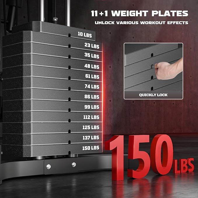 • 【All-in-One Home Gym】With just JELENS home gym system, you can unlock almost all fitness movements, including leg stretches, low row, seated row, chest flys, chest press, calf training, back extension and so on, saving space while achieving exercises for various muscle groups. Equipped with 11+1 weight plates at the same time, with a total weight of 150LBS, you can customize your exercise plan according to your own needs.