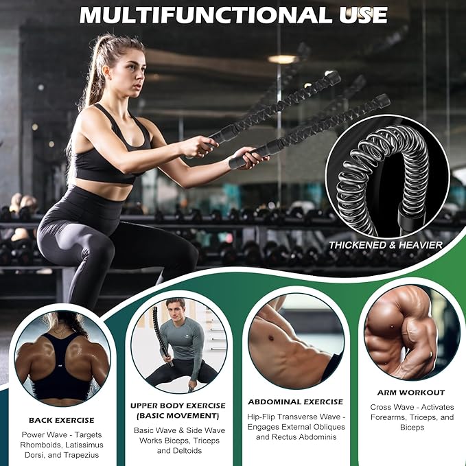 • Easy to Use: Our heavy rope requires no installation, so you can exercise anywhere, anytime, without the complicated installation and fixing of traditional battle ropes. It has more than 13 dynamic exercise options targeting arms, chest, back and legs, providing comprehensive HIIT, strength and endurance benefits.