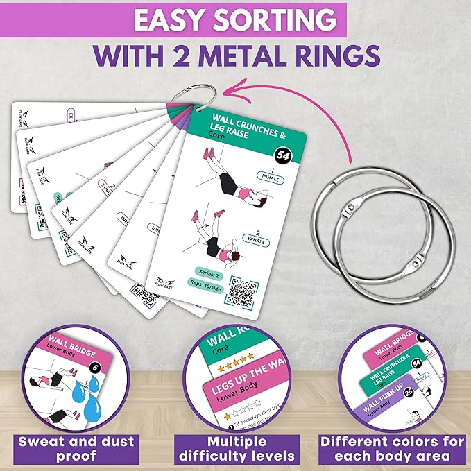 • STAY ORGANIZED & ON TRACK - Includes 2 metal rings for easy sorting and flipping during workouts. No more messy piles, keep your routine neat and accessible. The cards are also color-coded (Upper Body, Lower Body, Core, Total Body), so finding the right move is quick and easy.