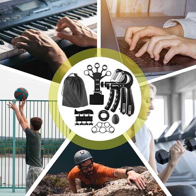 • COMPREHENSIVE HAND SET: The set includes 2 forearm adjustable resistance grippers, adjustable finger extenders, grip rings, hand squeeze balls, finger exercises, and finger extenders, which can specifically strengthen the muscles of the forearm, fingers, palm, and back of the hand, comprehensively improving grip strength, flexibility, and endurance. It is suitable for sports such as fitness, rock climbing, boxing, and piano playing