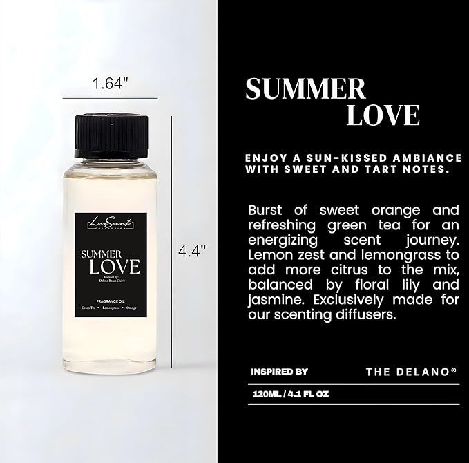• SUMMER LOVE Inspired by: THE DELANO | Enjoy a sun-kissed ambiance with sweet and tart notes. With a burst of sweet orange and refreshing green tea for an energizing scent journey. Lemon zest and lemongrass to add more citrus to the mix, balanced by floral lily and jasmine. Exclusively made for our scenting diffusers.