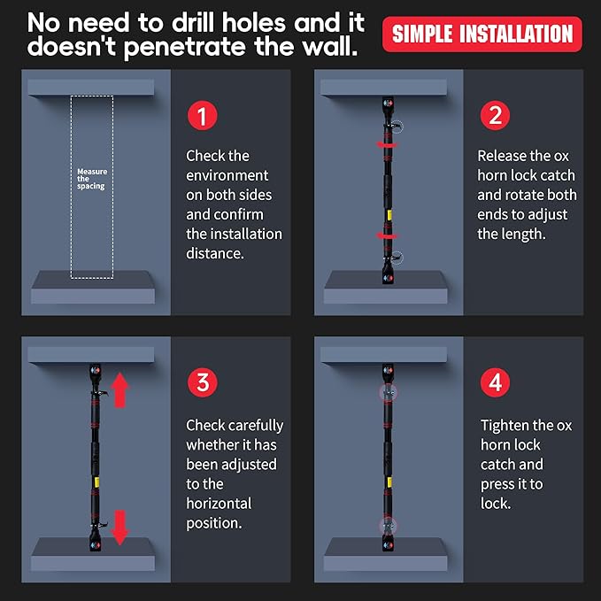 • 【Adjustable Pull Up Bar】The pull-up bar can fit in most door frame between 27.5"- 39". Note: Verify the marked rotation direction; reversing it may cause locking