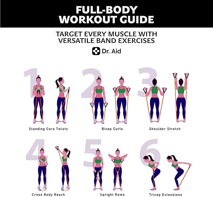 • Train every muscle, anywhere: Transform any space into your personal gym with Dr. Aid bands for working out. Designed for full-body training, these workout bands resistance sets help strengthen arms, shoulders, chest, core, glutes, and legs—anytime, anywhere. Whether you’re doing upper-body sessions at home, lower-body stretches on the go, or full routines at the gym, these stretch bands for exercise provide portable power and targeted muscle activation.