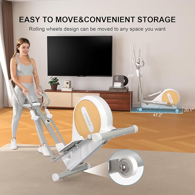 • SPACE-SAVING, DURABLE, AND EASY TO MOVE: Built with a heavy-duty steel frame and 330 lb capacity,this portable elliptical is made to last.Compact footprint (47"x20"x65") fits in any room and saves 20% more space than typical foldable ellipticals.Front transport wheels make it easy to relocate or store.