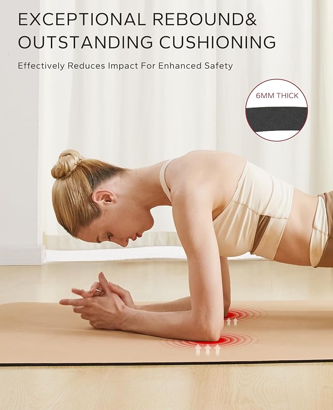 • 6mm Thick for Joint Support:This thick yoga mat’s 6mm design cushions joints during yoga, Pilates, and home workouts. The dual-layer structure absorbs impact, reducing pressure on knees, wrists, and elbows for comfortable, long-lasting sessions—perfect for the supportive cushioning your practice needs