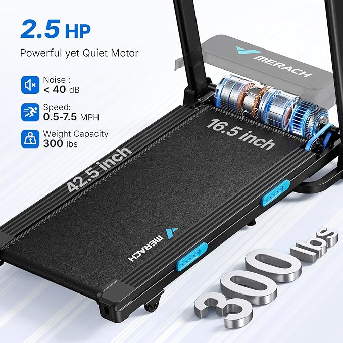 • 【Engineered for Quiet & Durable Performance】 Powered by a 2.5 HP powerful and quiet mo tor, the MERACH compact treadmill delivers stronger, smoother, and quieter performance (<40 dB) compared to ordinary treadmills. The advanced motor design reduces heat, prevents belt slippage, and extends lifespan—built for years of reliable workouts at home.