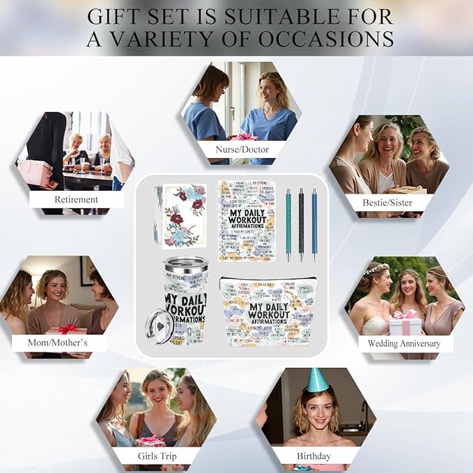 Daily Affirmations for Women Workout Encouragement Mental Health Inspirational Gifts for Women Coworker Boss Birthday Friendship Christmas, Office 6PCS 20oz Tumbler Makeup Bag Ballpoint Pen Notebook