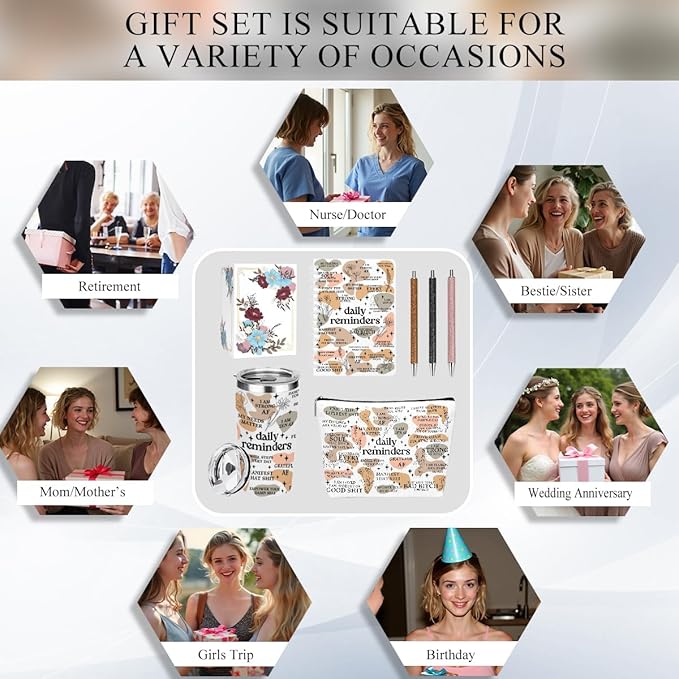 • Daily Reminder Gifts Set: Inspirational gifts for women combination pack includes 1 pcs positive 20OZ tumbler, 3 pcs glitter ballpoint pens, 1 pcs motivational notebook, 1 pcs makeup bag and 1 pcs exquisite gift box. This is a practical and thoughtful set with sufficient quantity to meet your different gift-giving needs and express your love and care for friends or coworkers.
