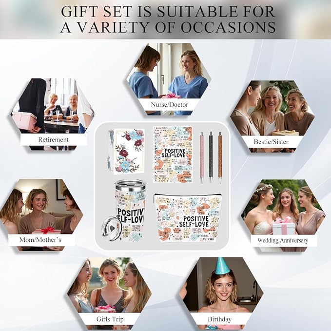 • Positive Self Love Gifts Set: Inspirational gifts for women combination pack includes 1 pcs positive 20OZ tumbler, 3 pcs glitter ballpoint pens, 1 pcs motivational notebook, 1 pcs makeup bag and 1 pcs exquisite gift box. This is a practical and thoughtful set with sufficient quantity to meet your different gift-giving needs and express your love and care for friends or coworkers.