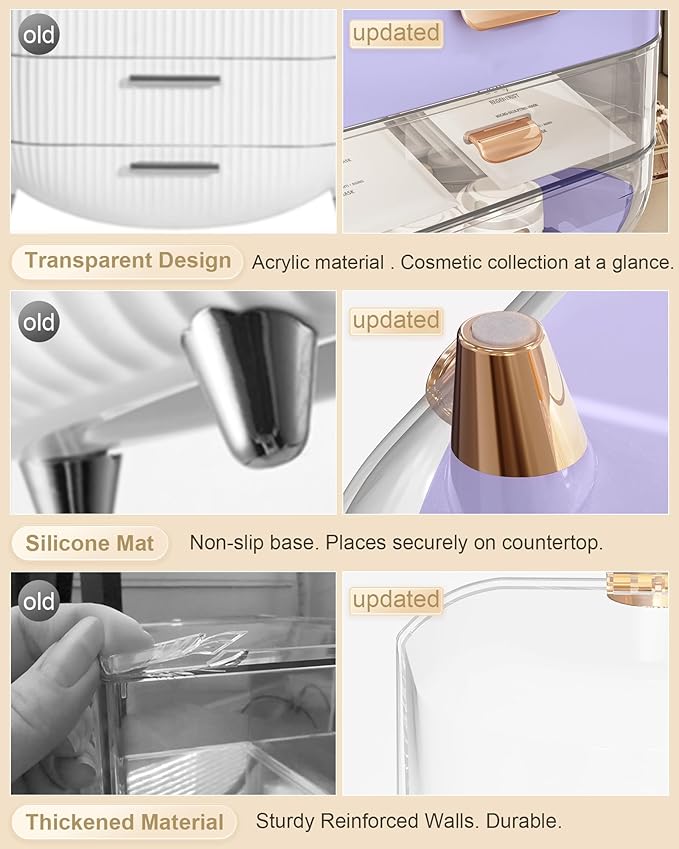 • 🎁【Thickened Material & Non-slip】Reinforced and upgraded handle won't fall off. Easily move the skin care organizer to anywhere. The countertop organizer is made of thickened ABS material, which is stronger and more durable than normal ones. Drawer and clear top are able to open and close easily. Rubberized bottom, non-slip and won't scratch desktop.