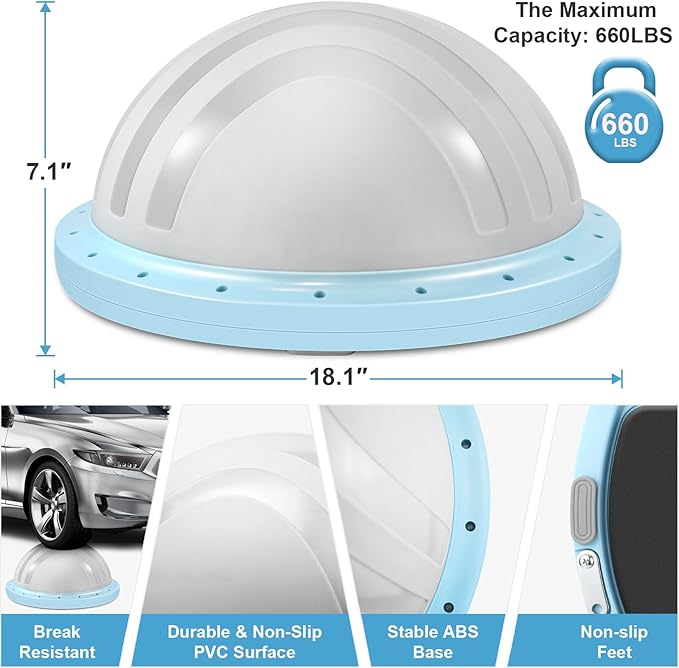 • Patented Unique Plank Trainer Ball. Design with innovative removable plank handle and comfortable elbow support pad, combining the exercise half ball and plank board trainer into one machine ,satisfy for your different workout needs. Perfect to workout your whole body at home and office, in the gym, or in yoga room,.etc.