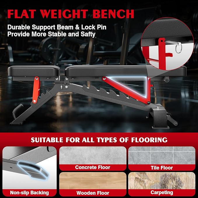 • Double-Lock Safety – Train Fearlessly At Max Weight: Slide the steel lever, secure the safety pin, and activate the triangular reinforced frame—tested for 20,000+ cycles. Guarantees a 180° rock-solid flat position with zero wobble. Lift heavy with confidence—safety’s built into every rep.