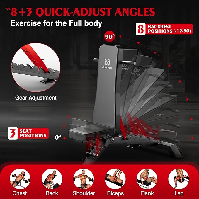 • 8+3 Adjustments – Your All-In-One Workout Partner: Switch from 90° upright rows to decline sit-ups in seconds with the C-lock lever. 8 backrest + 3 seat positions cover incline, flat, and decline—perfect for chest presses, dumbbell curls, and HIIT. Ditch multiple benches; this does it all for full-body training.