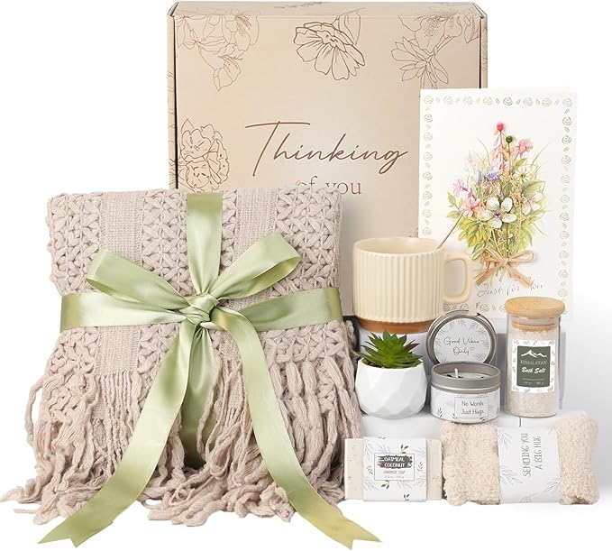 • A Hug in a Box: Our spa gift baskets for women deliver a thoughtful blend of comfort and care. The soft knitted tassel blanket provides a warm embrace, while the elegant gift box and heartfelt gift card convey your sincere wishes. It's the perfect way to say "I'm thinking of you" with a gift that feels like a hug in a box.