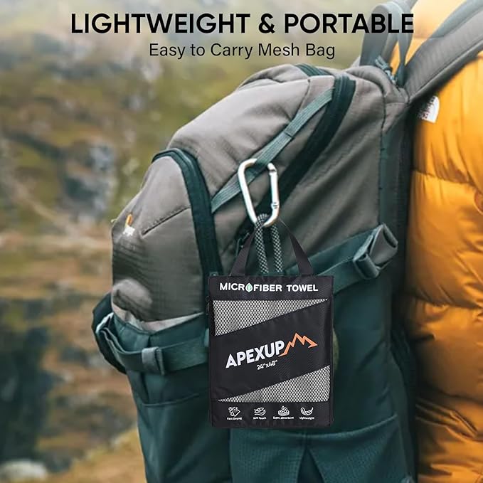 • Lightweight and Soft: APEXUP Gym towel is made from high quality microfiber materials for a gentle feel on your skin; Whether you're drying off after a shower or relaxing at the beach, its smooth and soft microfiber texture provides exceptional comfort; Moreover, its lightweight and compact design allows for easy storage in backpacks or suitcases