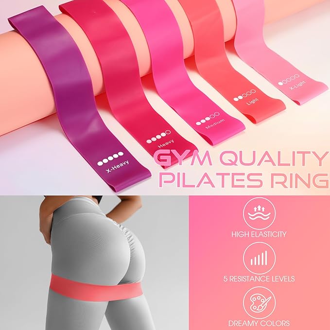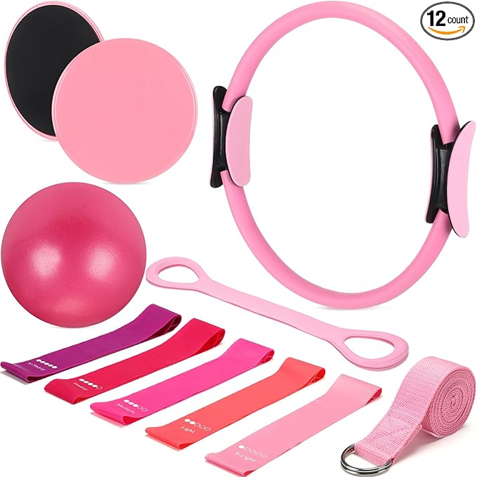 • 6 Exercise Sets: unleash your fitness potential with our comprehensive 6-set Pilates kit! Featuring a 14-inch fitness ring, a 9-inch ball, a 71-inch yoga strap, silicone tension strip, a 5-piece resistance band set, and a pair of sliding discs, these expertly curated essentials cater to both beginners and seasoned practitioners; Elevate your workout routine with these tool, tools designed to enhance your Pilates practice and take your fitness journey to the next level