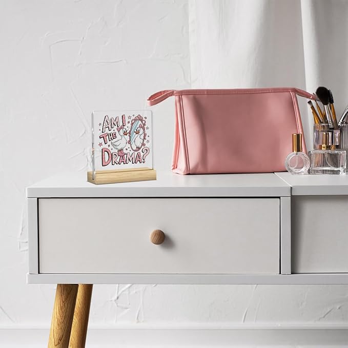 Cute Funny Mental Health Decor, Motivational Gifts for Women Men, Cute Coquette Silly Goose Inspirational Acrylic sign with Wooden office Accessories Bedroom Dorm Apartment Decor-Am I The Drama