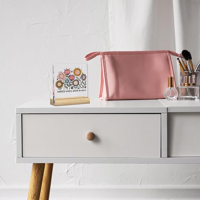 Mental Health Decor, Motivational Gifts for Women Men, Boho Floral Inspirational Acrylic sign with Wooden office Accessories Bedroom Dorm Apartment Decoration-Words Matter Speak Kindness